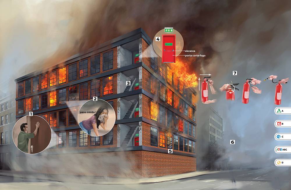 Durante a fuga, antes de abrir qualquer porta, coloque a mão nela para sentir a temperatura. Se ela estiver quente, não abra. Se estiver fria, abra bem devagar, mantendo seu corpo protegido atrás da porta (e não diante da passagem). Se você sentir calor ou pressão vindo do outro cômodo, feche e procure outra rota.